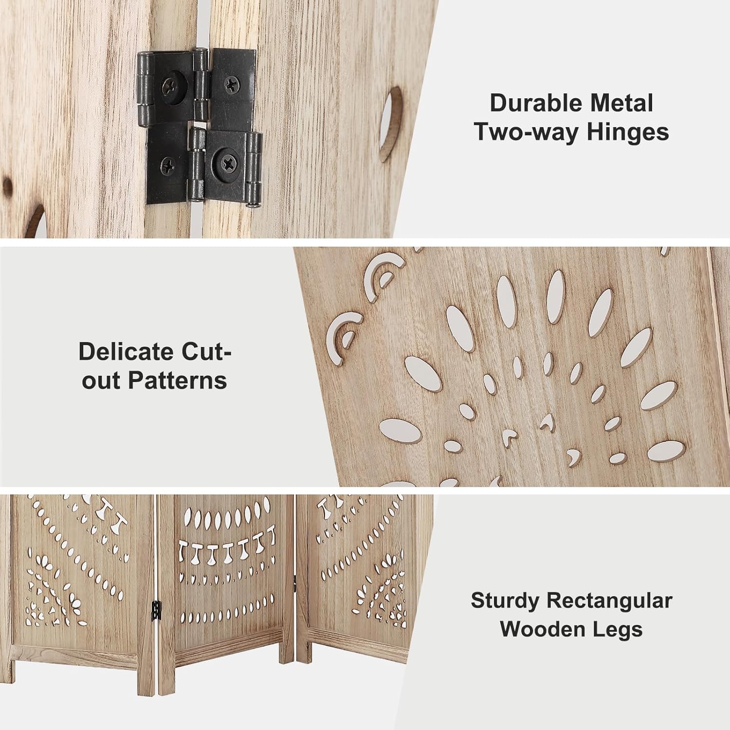 3 Panel Wooden Room Divider Screen - 8 Foot Tall Rustic Wood Privacy Partition with Floral Carved Cutouts, Foldable Farmhouse Decor for Bedroom, Home Office, Garden & Terrace (Natural)