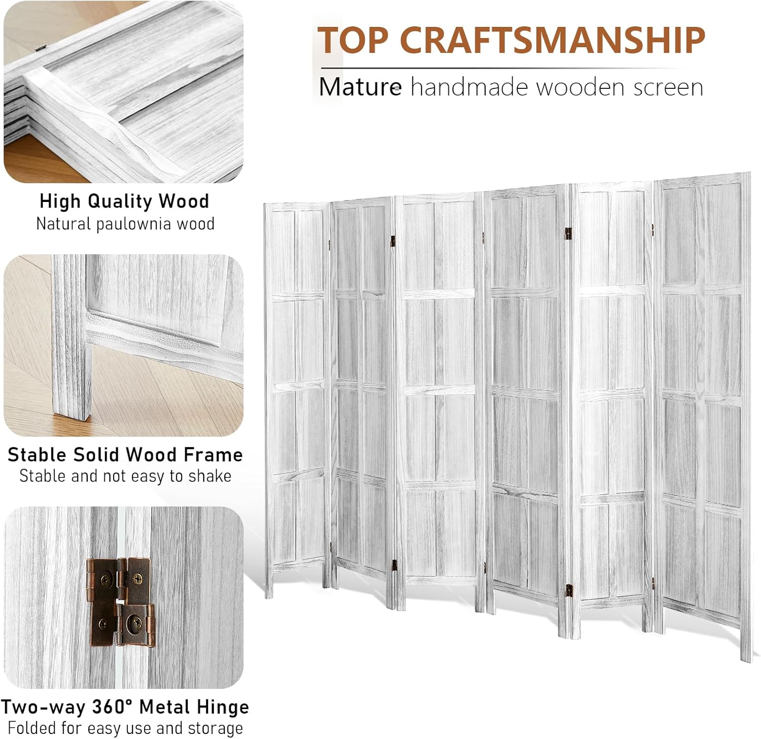 6 Panel Wood Room Divider Screen, 5.6 FT Folding Privacy Screen Room Divider, Partition Divider for Room Separation, Folding Wood Panel Wall Divider for Home Office Bathroom (Retro White)