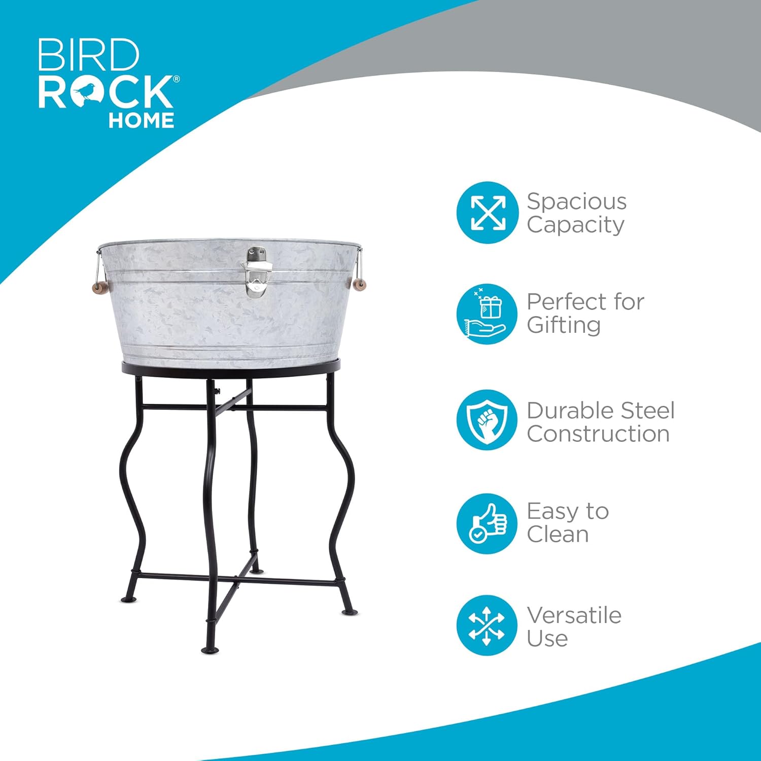 BirdRock Home Galvanized Beverage Tub with Stand is the perfect way to keep your refreshments cold for your party with a durable beverage holder including an attached bottle opener. The beverage tub is equipped with a metal stand providing an elevated way to display sodas, waters or beer for your party and family gatherings. The beverage tub can be easily removed from stand to pour out water and clean. Transport the tub easily with wooden handles on either side. The beverage tub holds over 25 bottled sodas, beer, or water. Or up to 10 wine/champagne bottles. Host your party, family gathering with BirdRock Home Galvanized Beverage Tub.