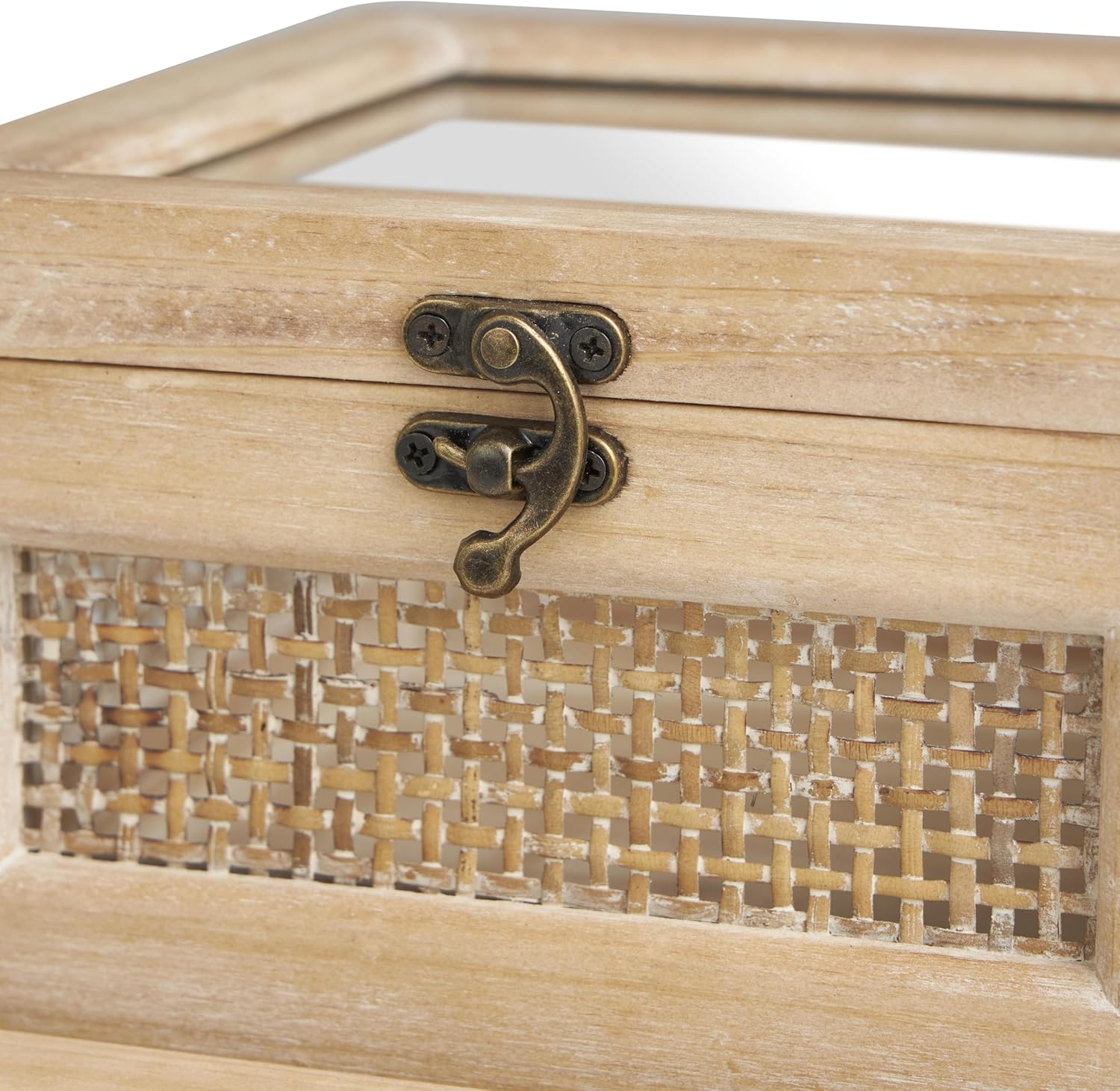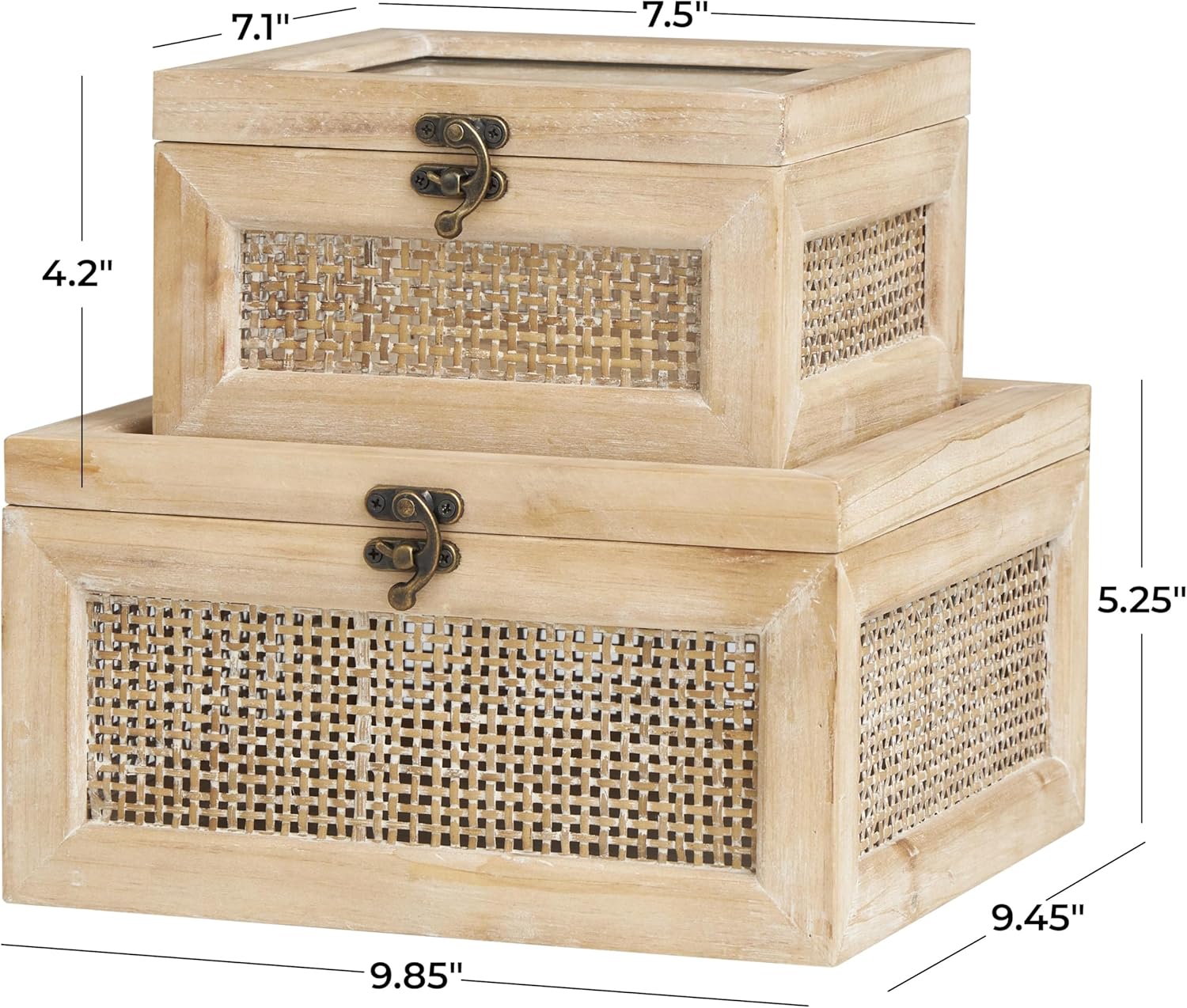 Deco 79 Wood Decorative Box Glass Top Decorative Keepsake Boxes with Rattan Side Panels and Bronze Hook Closures, Set of 2 Storage Boxes 9", 7" W, Light Brown