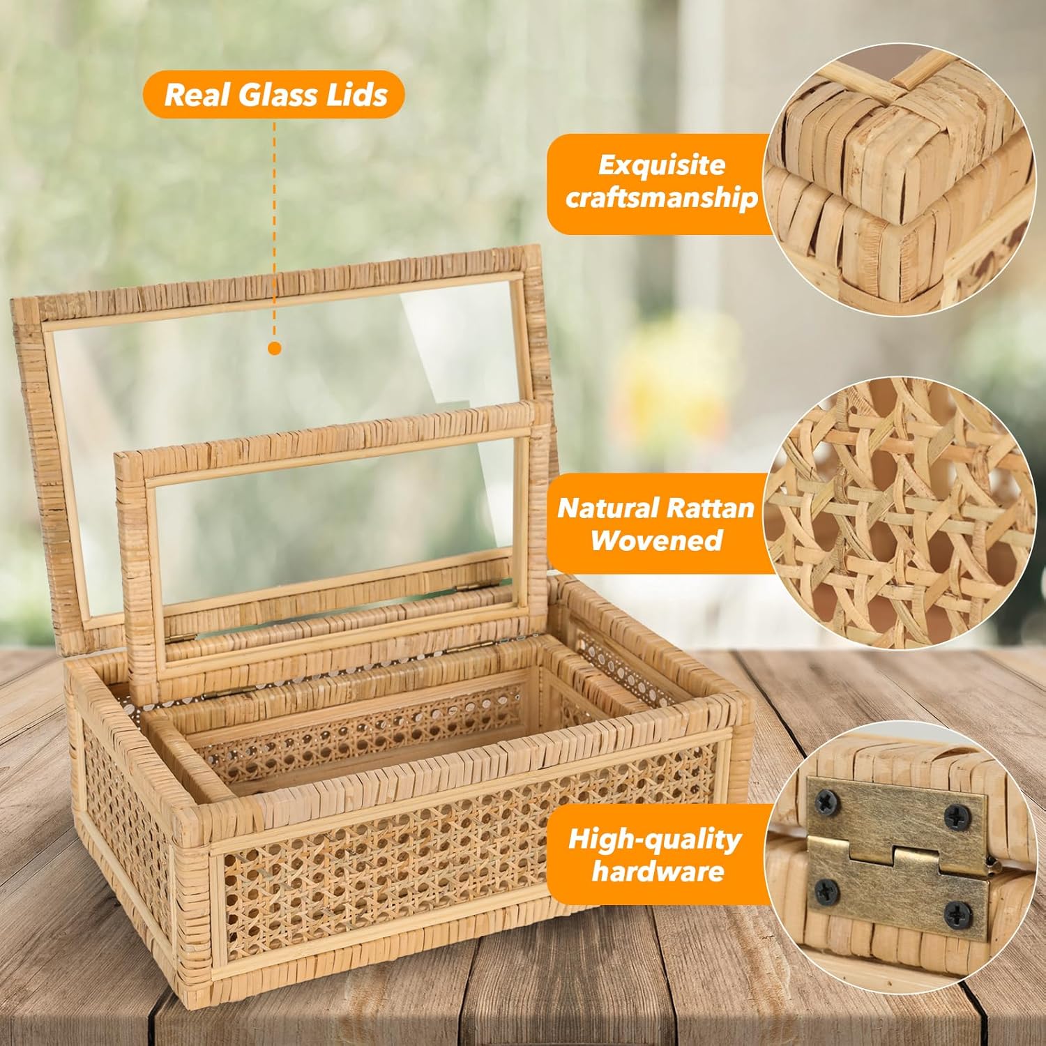 -Introducing our Boho Woven Rattan Display Boxes with Glass Lids, a perfect blend of style and functionality. These handwoven storage boxes feature intricate rattan weaving and elegant cane paneling around a sturdy wooden frame, creating a bohemian-inspired look that effortlessly enhances your home decor.