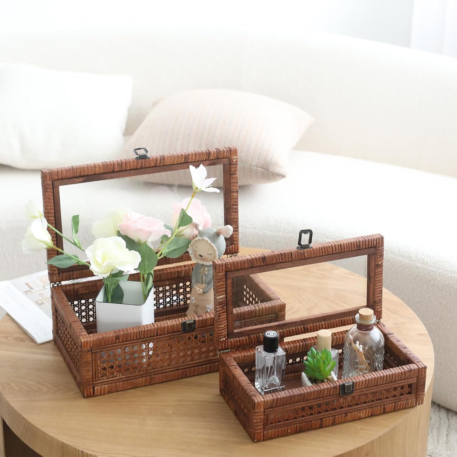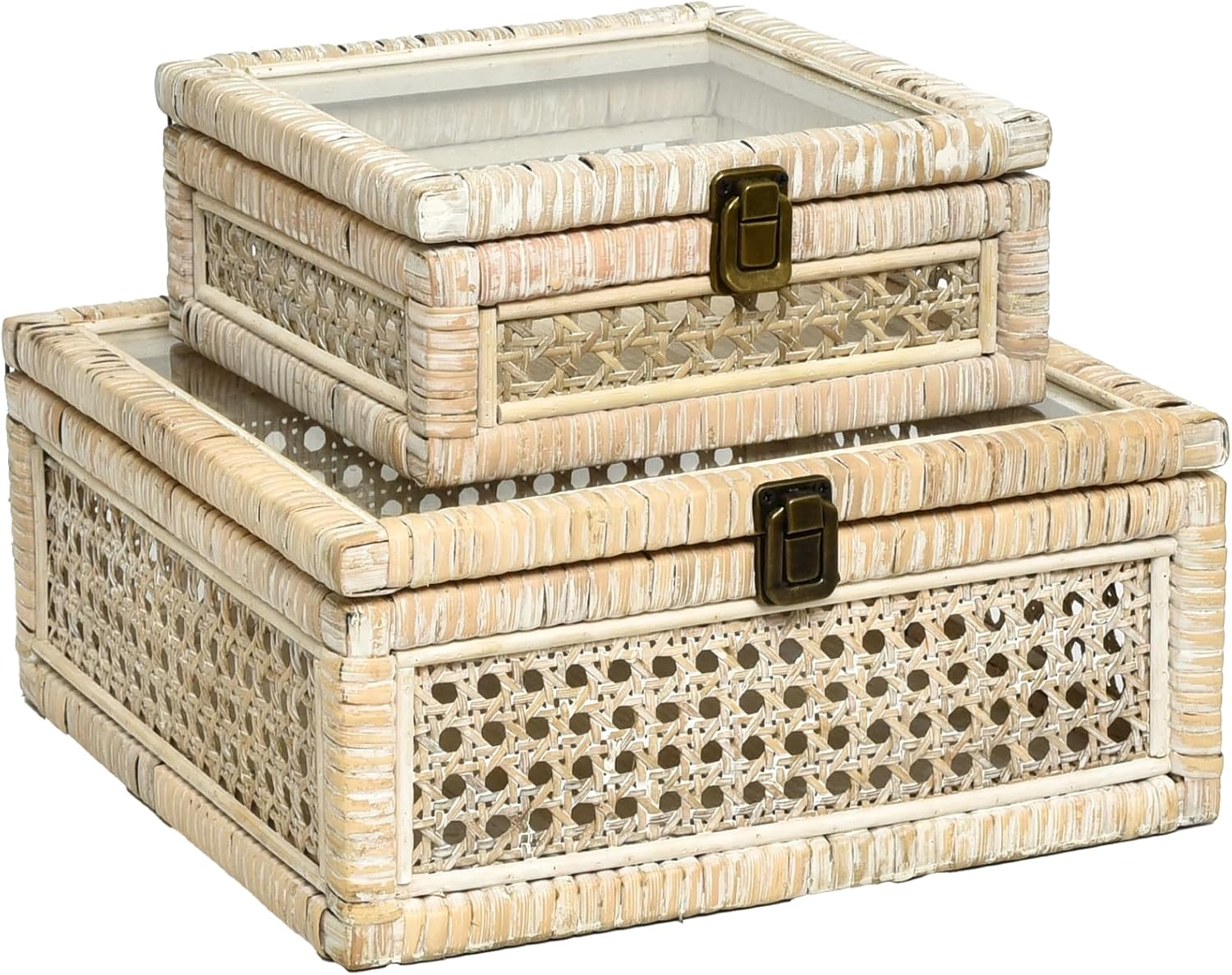 Rattan and Cane Stacking Boxes with Glass Top Lid - Set of 2 11.8" and 14.1", for Boho and Rustic Farmhouse Decor, Brown