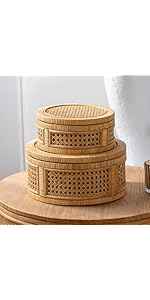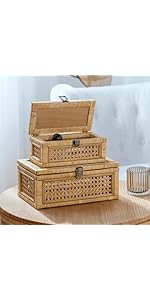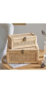 Rattan Box, Boho Decorative Boxes with Lids, Set of 2 Rectangular Wicker Storage Basket, Natural Woven Cane Bins for Home Decor (Rectangular)