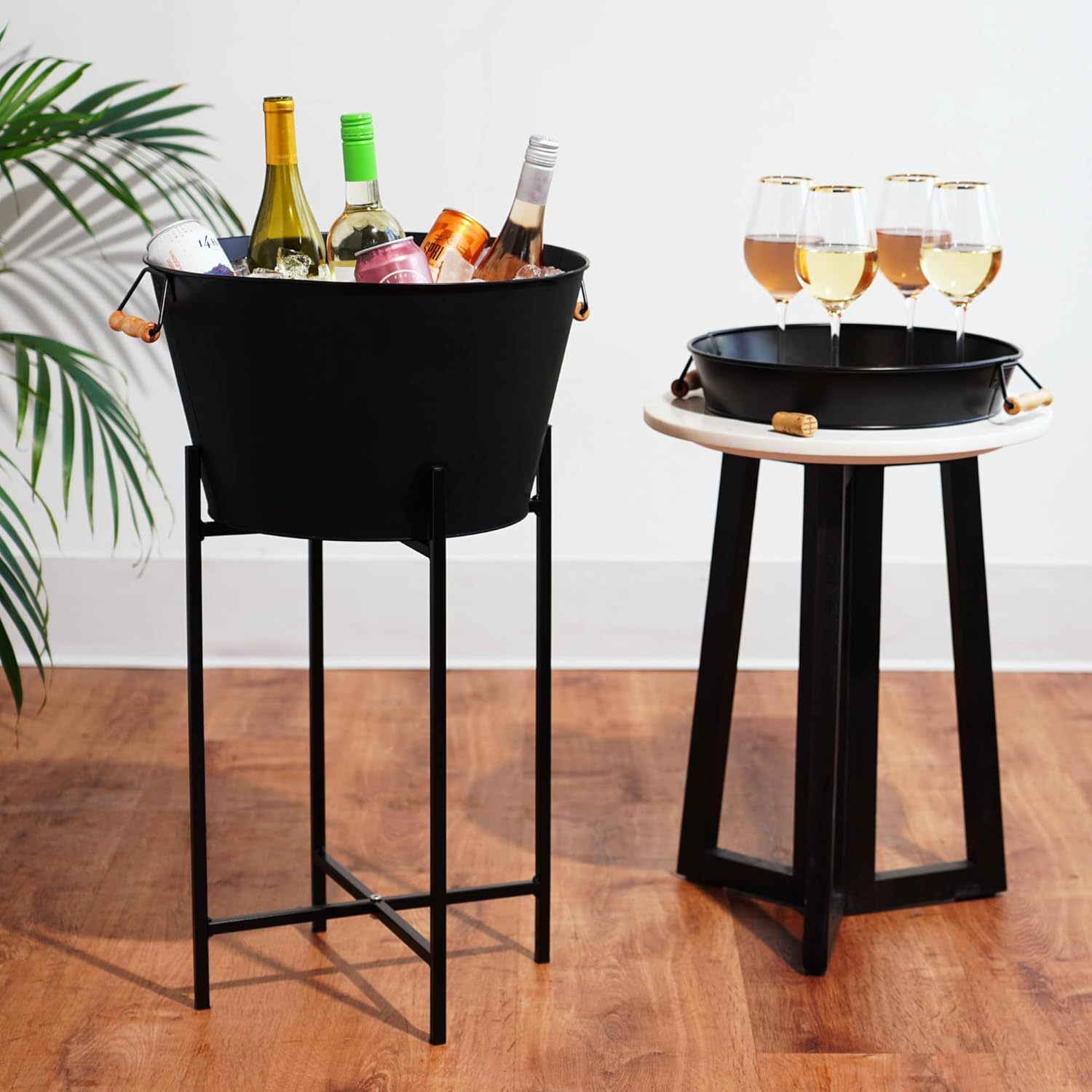 Twine Black Beverage Tub with Collapsible Stand, Large Metal Bucket and Tray, Ice Drink Buckets with Acacia Wood Handles for Parties, 3-Piece Set