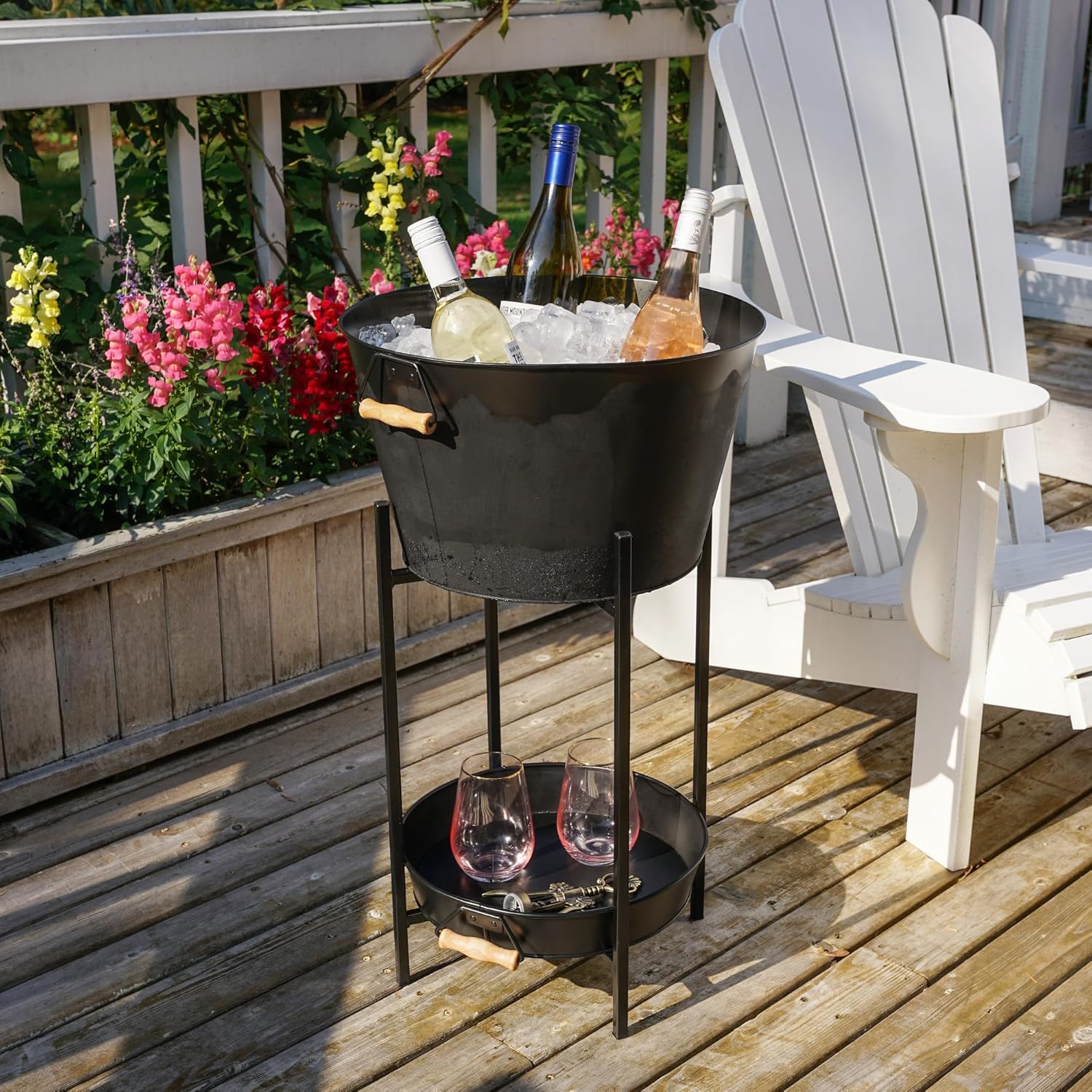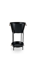 Perfect for parties, this ice bucket and tray set comes with a matching collapsible stand. Made from galvanized metal with a powder coated black finish and wooden handles, the tub and tray are removable and ideal for serving drinks or chilling wine.